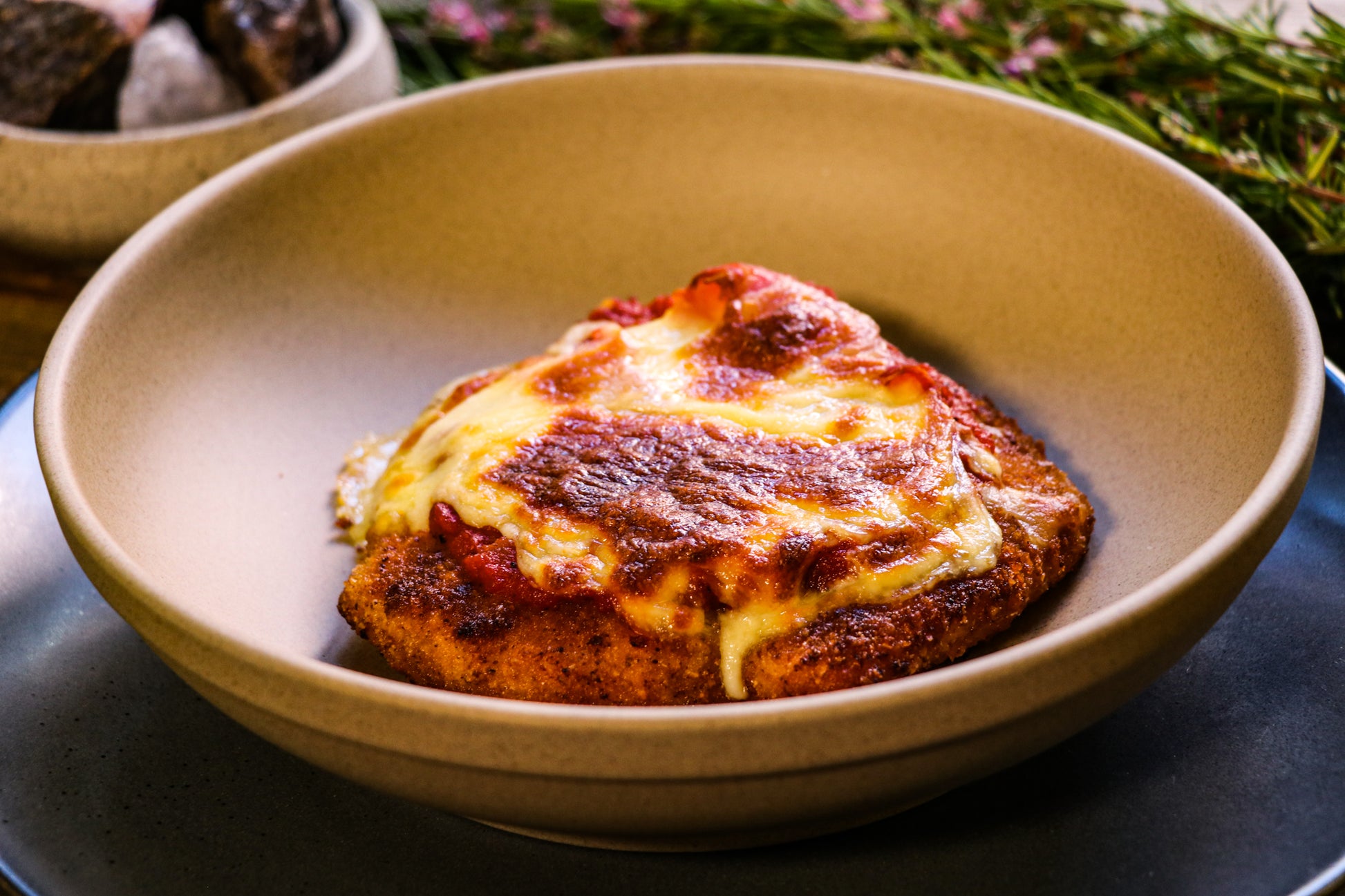 Succulent crumbed chicken breast fillet topped with ham, mozzarella cheese and tomato puree. Downright delightful.
